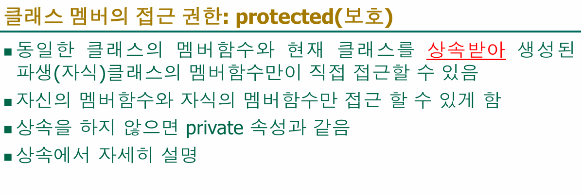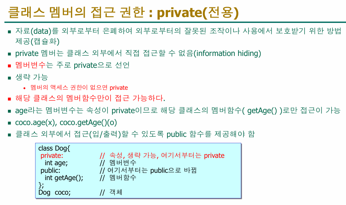 - 따라서 특별히 상속을 고려하지 않는 한, 멤버 변수는 대부분 private으로 선언하는 게 관례예요.