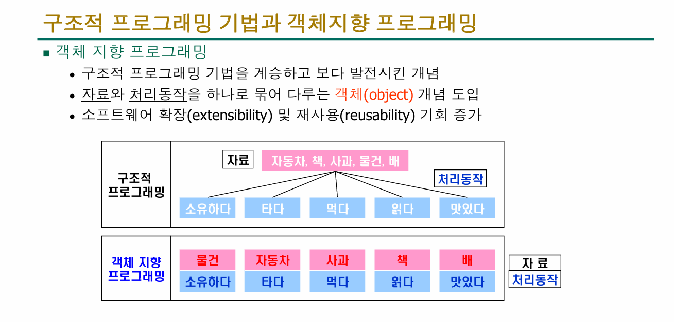 즉, 프로그램을 단순히 “명령어 나열”로 보는 게 아니라, 객체들의 집합과 상호작용으로 보는 거죠.