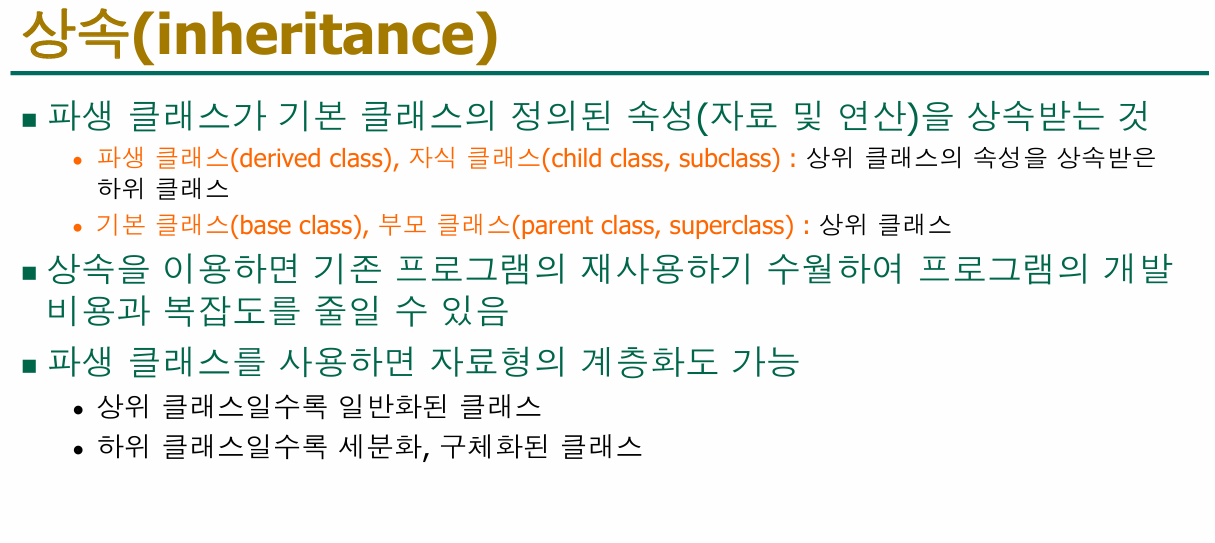 - 기존 클래스(부모, 슈퍼클래스)의 속성과 기능을 새로운 클래스(자식, 서브클래스)가 물려받아 재사용할 수 있습니다.