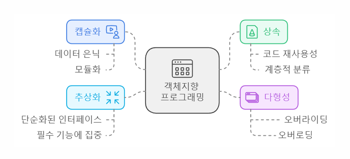 객체지향 언어(OOP, Object-Oriented Programming)의 주요 특징 4가지는 다음과 같아요 👍