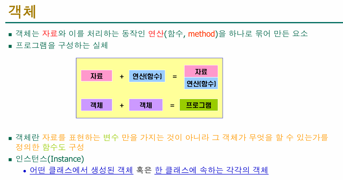 - 그래서 데이터 + 기능을 하나로 묶은 객체(Object)라는 개념이 등장했어요.