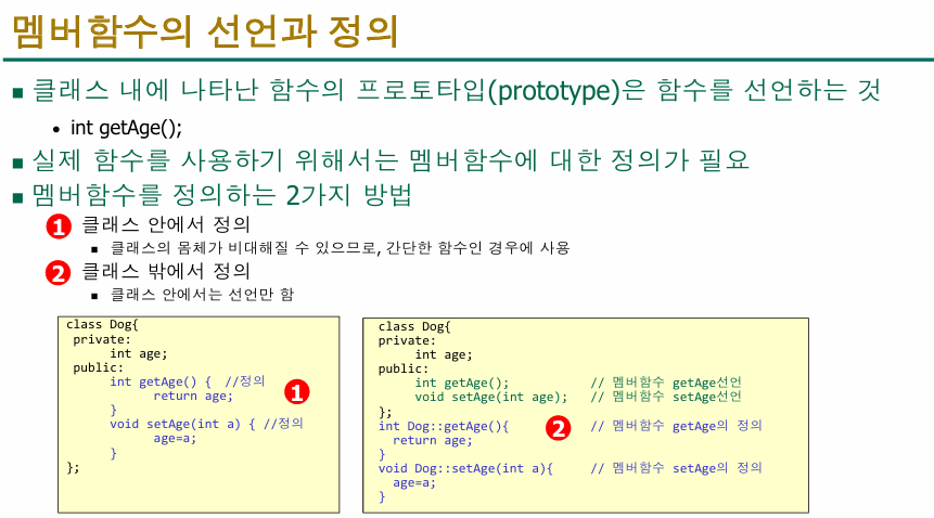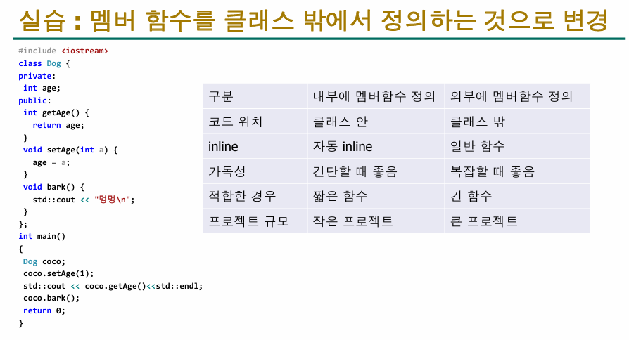 클래스 선언부(class 안)와 클래스 외부(스코프 밖)에서 멤버 함수를 정의하는 방식을 혼합해서 사용한 예제입니다.