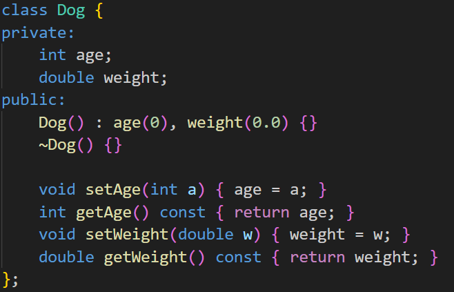 - age와 weight는 private 멤버 변수로 외부에서 직접 접근할 수 없어요.