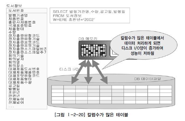 대용량 데이터베이스에서는 테이블 구조와 인덱스 설계가 성능에 큰 영향을 미칩니다. 많은 열을 가진 테이블은 디스크 I/O를 증가시켜 성능 저하를 초래할 수 있습니다. 예를 들어, "도서정보"라는 테이블에서 2002년의 특정 필드를 쿼리하는 경우, 많은 열이 있는 테이블은 쿼리 성능에 부정적인 영향을 미칠 수 있습니다